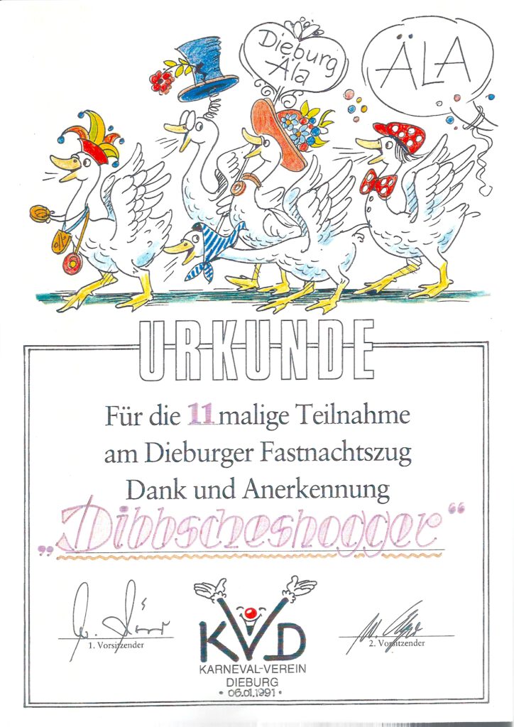 Unsere Urkunde des KVD für unsere 11-malige Teilnahme am Dieburger Fastnachtszug.