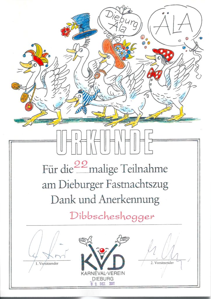 Unsere Urkunde des KVD für unsere 22-malige Teilnahme am Dieburger Fastnachtszug.